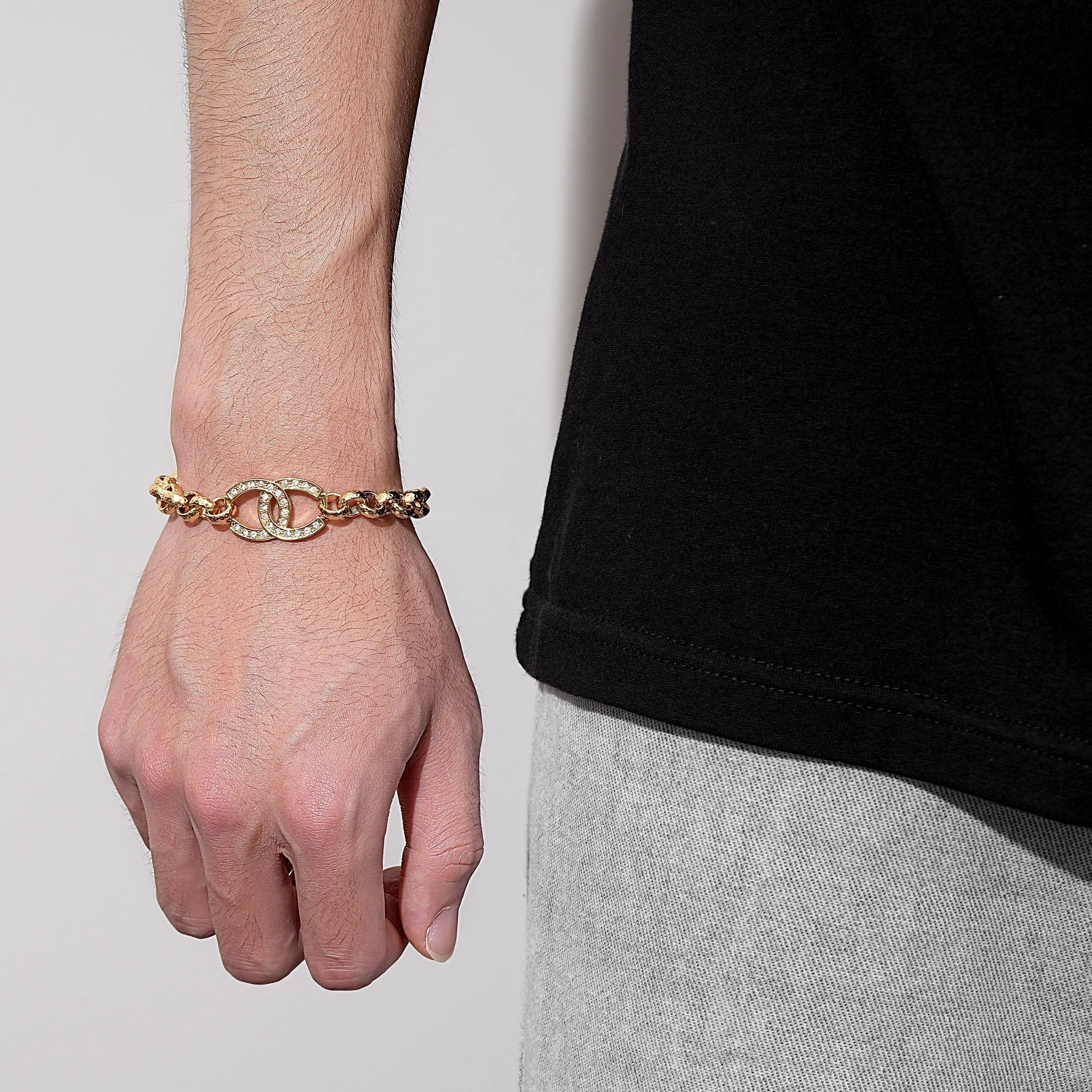 This gold Belcher bracelet weighs 27 grams and has a width of 8mm. It comes in lengths of 8 or 8.5 inches, making it a comfortable fit for most wrists. The bracelet features a beautiful gold horse shoe design with sparkling stone crystals for added elegance. Made with gold bonded material, it has a shiny finish that lasts. The diamond cut pattern on the Belcher links adds extra detail, making this piece stand out. Whether worn for a special event or just as a daily accessory, this bracelet will add a touch of charm to any outfit.
