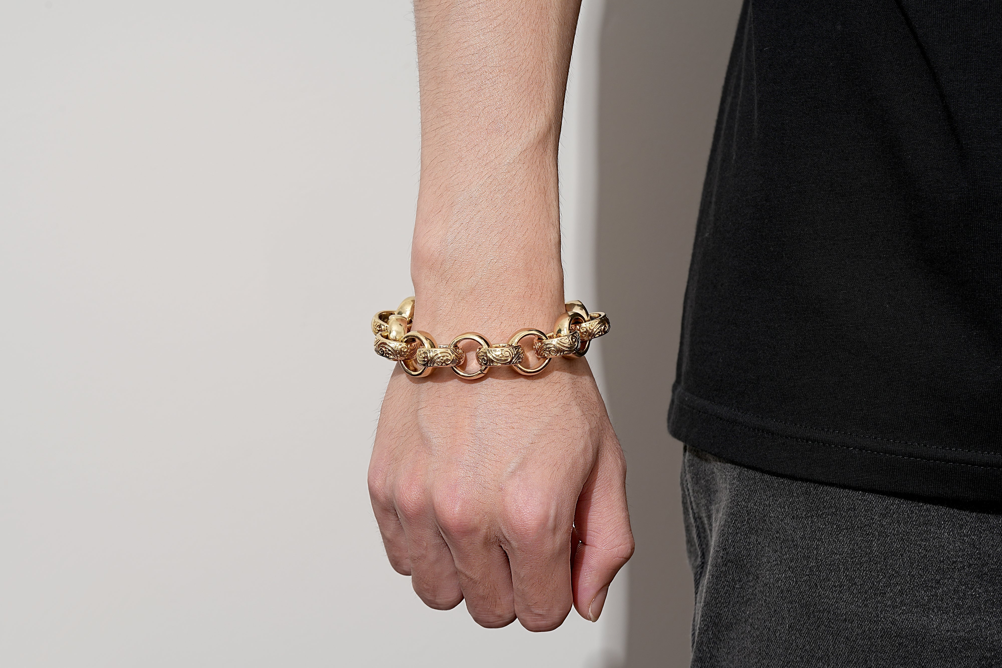 The 18mm Gold Crystal Belcher Bracelet is the widest, most fully iced bracelet in the Bling King collection. Oversized belcher links carry crystal stone settings across the entire face of the bracelet, creating full iced-out coverage that catches light from every direction. At 95g across 18mm it is impossible to ignore. Albert clasp secures it with authority.